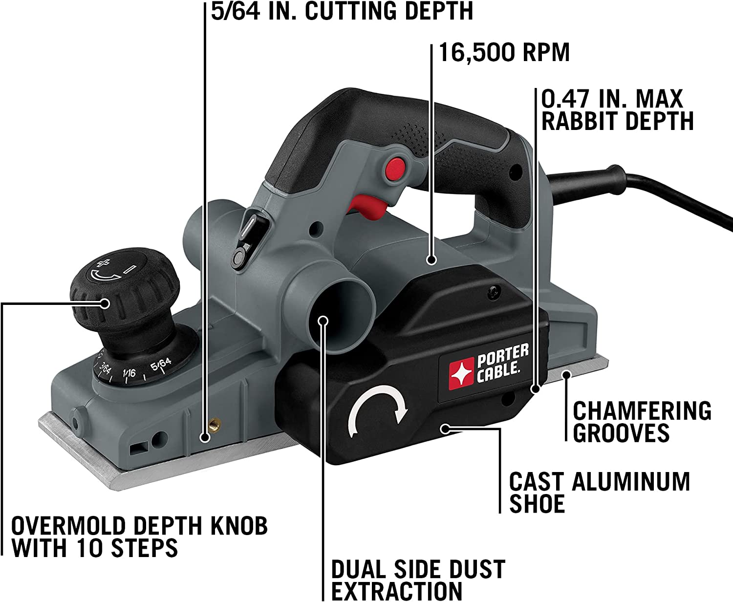 The 11.5-inch cast aluminum shoe provides added control and superior finish quality. With a 5/64-inch depth of cut, this hand planer can remove excess material quickly and easily.